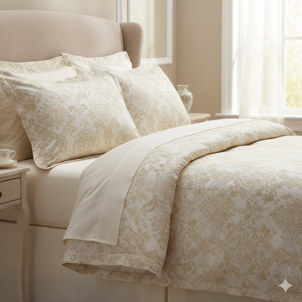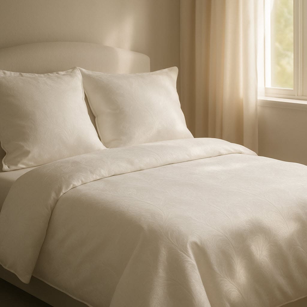 Damast ist bekannt für seinen feinen, schimmernden Glanz und die eleganten Muster. Durch die spezielle Webart wirkt der Stoff besonders edel und hochwertig. Auf der Haut fühlt sich Damast weich und angenehm kühlend an – ideal für Bettwäsche und Tischwäsche.