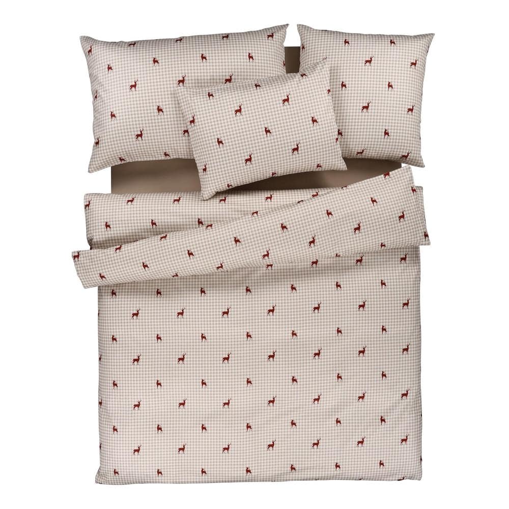 Diese Bettwäsche zeigt ein klassisches, fein kariertes Muster in warmen Beige- und Cremetönen. Darauf sind kleine Hirschmotive in einem dunklen Rotbraun gleichmässig verteilt, was dem Design einen charmanten, alpinen Charakter verleiht.