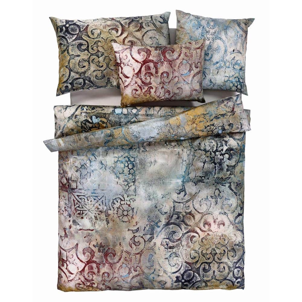 Diese Bettwäsche fasziniert mit einem eindrucksvollen, künstlerischen Design, das an antike Wandmalereien erinnert. Verwaschene Ornamente in Gold-, Blau-, Beige- und Bordeauxtönen verschmelzen zu einer harmonischen Gesamtkomposition mit faszinierender Tiefe und Struktur.