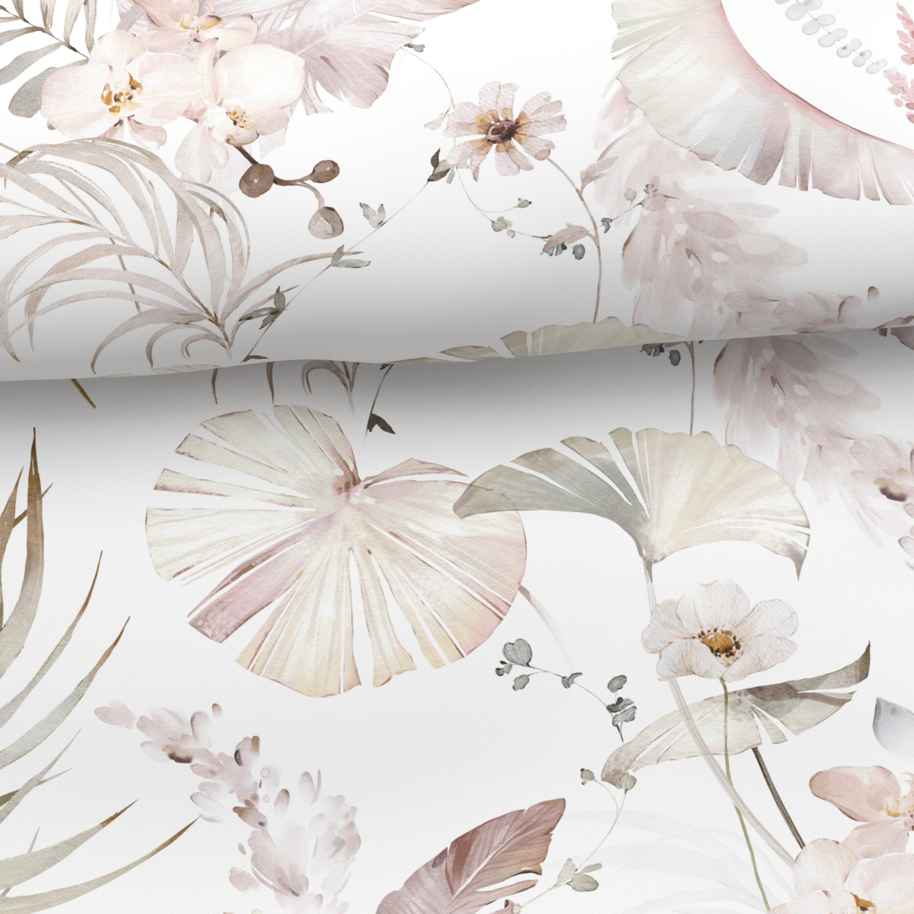 Diese Bettwäsche strahlt pure Leichtigkeit und Eleganz aus. Zarte Blätter und Blüten in sanften Pastelltönen von Rosé, Beige und Creme verteilen sich harmonisch auf weissem Grund. Die aquarellartige Gestaltung mit feinen Linien und weichen Farbverläufen verleiht dem Design eine moderne, zugleich romantische Note.