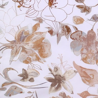 Die Bettwäsche zeigt ein harmonisches, florales Design in warmen Naturtönen. Zarte Blütenmotive in Beige, Braun und hellen Grauschattierungen verteilen sich gleichmässig auf weissem Hintergrund. Der sanfte Farbverlauf und die feine Linienführung verleihen dem Muster eine edle, fast künstlerische Wirkung.