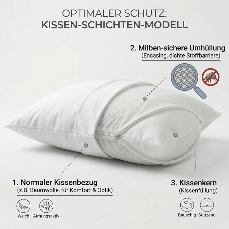 Ein milbendichter Kissenbezug schützt genau diesen nahen Kontaktbereich. Dadurch wird das Kopfkissen gezielt in ein durchdachtes Schutzsystem im Bett eingebunden.