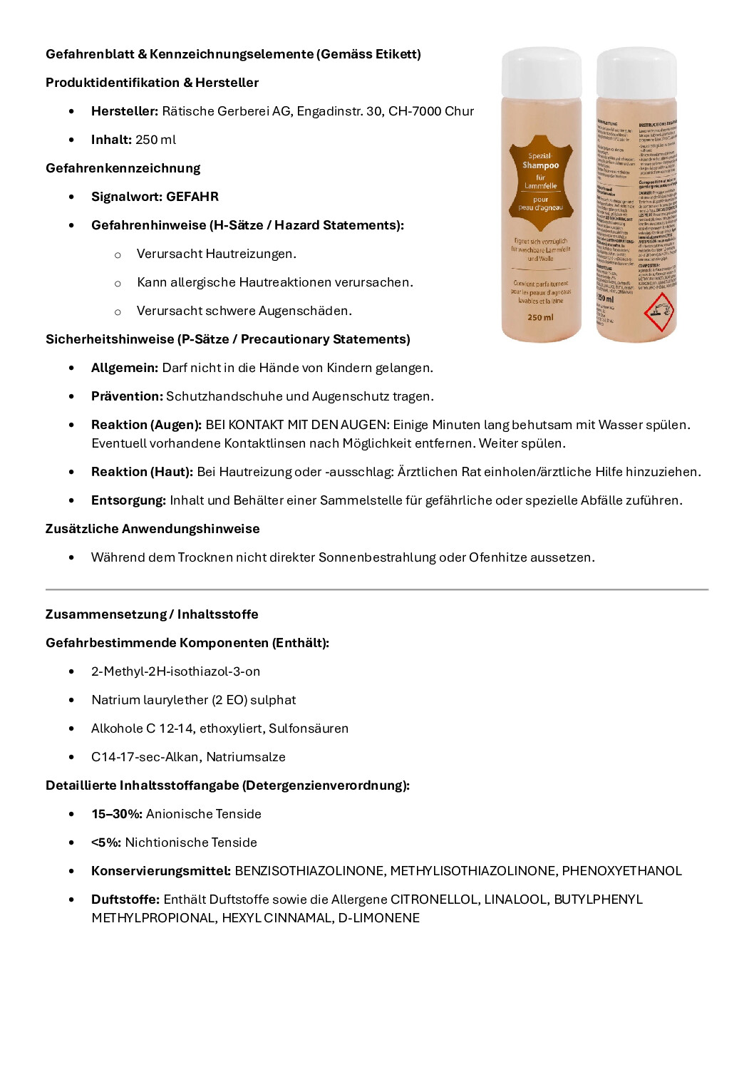 Damit Ihre Lammfelle und Wollsachen lange weich und schön bleiben, brauchen sie die richtige Pflege. Unser Spezial-Shampoo reinigt besonders sanft. Es entfernt Schmutz und unangenehme Gerüche zuverlässig.